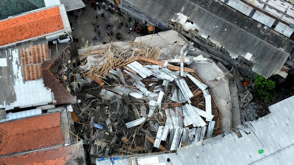 Bangunan empat lantai yang tengah dalam proses pengecoran itu ambruk tak lama setelah pekerjaan dilakukan pada pagi harinya. Tiang pondasi diduga tidak mampu menahan beban pengecoran, menyebabkan struktur runtuh hingga ke lantai dasar.